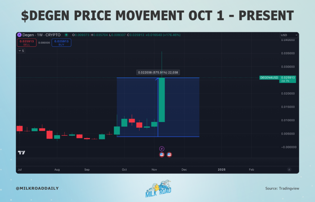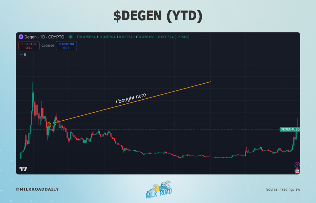 So lemme grab the mic real quick and hit you with a cautionary tale about a memecoin ($DEGEN) I aped into about seven months ago…