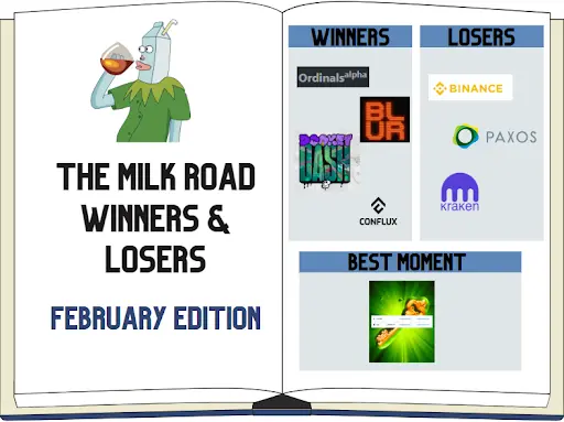 Gm. This is Milk Road, the "Godfather 2" of crypto newsletters. Each issue is just as great, if not better, than the one before it. Here’s what we’ve got for you today: February Recap: Winners & Losers All cryptos minus Bitcoin are securities - SEC FEBRUARY RECAP: WINNERS & LOSERS Well, ladies and gents, that’s......