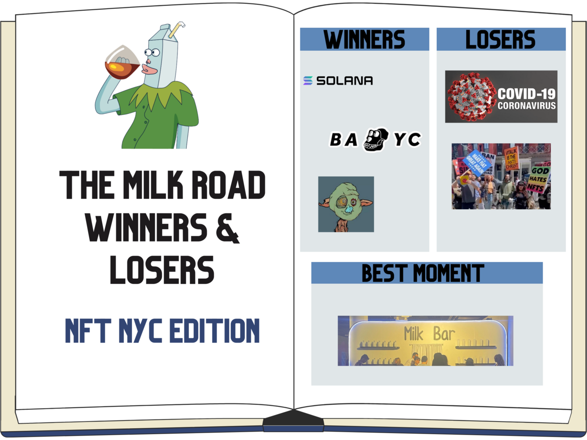 GM. This is the Milk Road. We’re like your favorite pair of jeans - comfortable, reliable, and always there when you need us.Let’s get into the good stuff: The Winners & Losers of NFT NYCCrypto bailouts for Celsius & BlockFi?Bite-sized treatsMeme of the dayWINNERS & LOSERS OF NFT NYCTime for everybody’s favorite segment: Winners &......