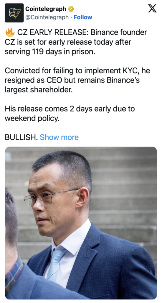 Changpeng Zhao (CZ), former Binance CEO, is ending his four month prison sentence two days earlier than expected…