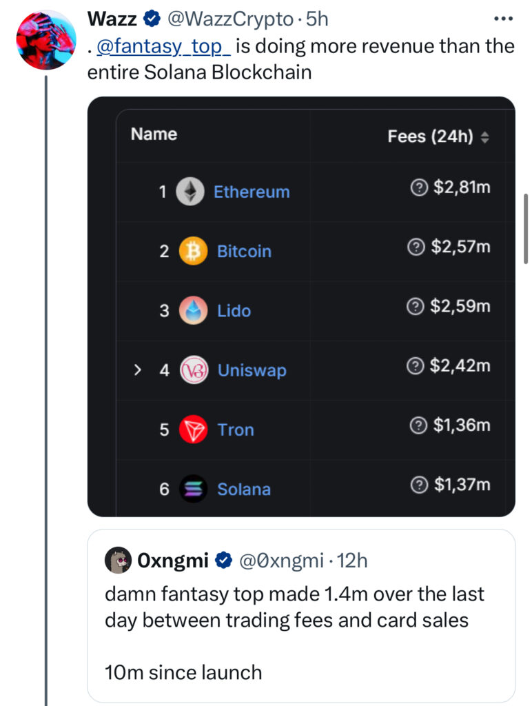 Fantasy Top is even outpacing Solana in revenue generation…. $1.4M > $1.37M over 24hrs.