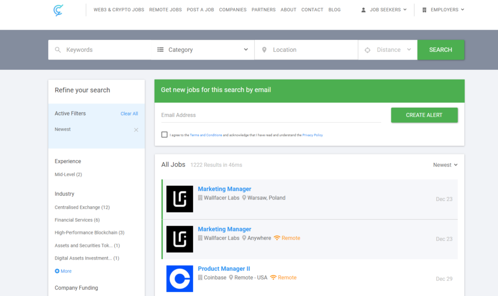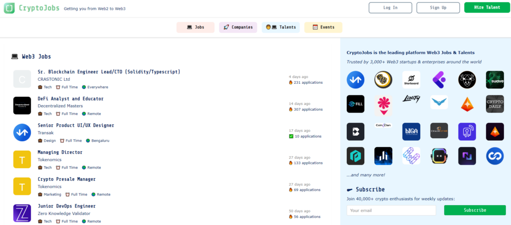 The website partners with big names in the crypto space such as Aave and Gitcoin to bring you the latest job openings. You can subscribe to their weekly newsletter, which will deliver new job postings directly to your inbox. Cryptocurrencyjobs.co also provides a “Web3 Talent Collective” program which allows you to create a profile, add your relevant work experience, and get noticed by recruiters and partners from the site’s network who may reach out to you based on your experience.