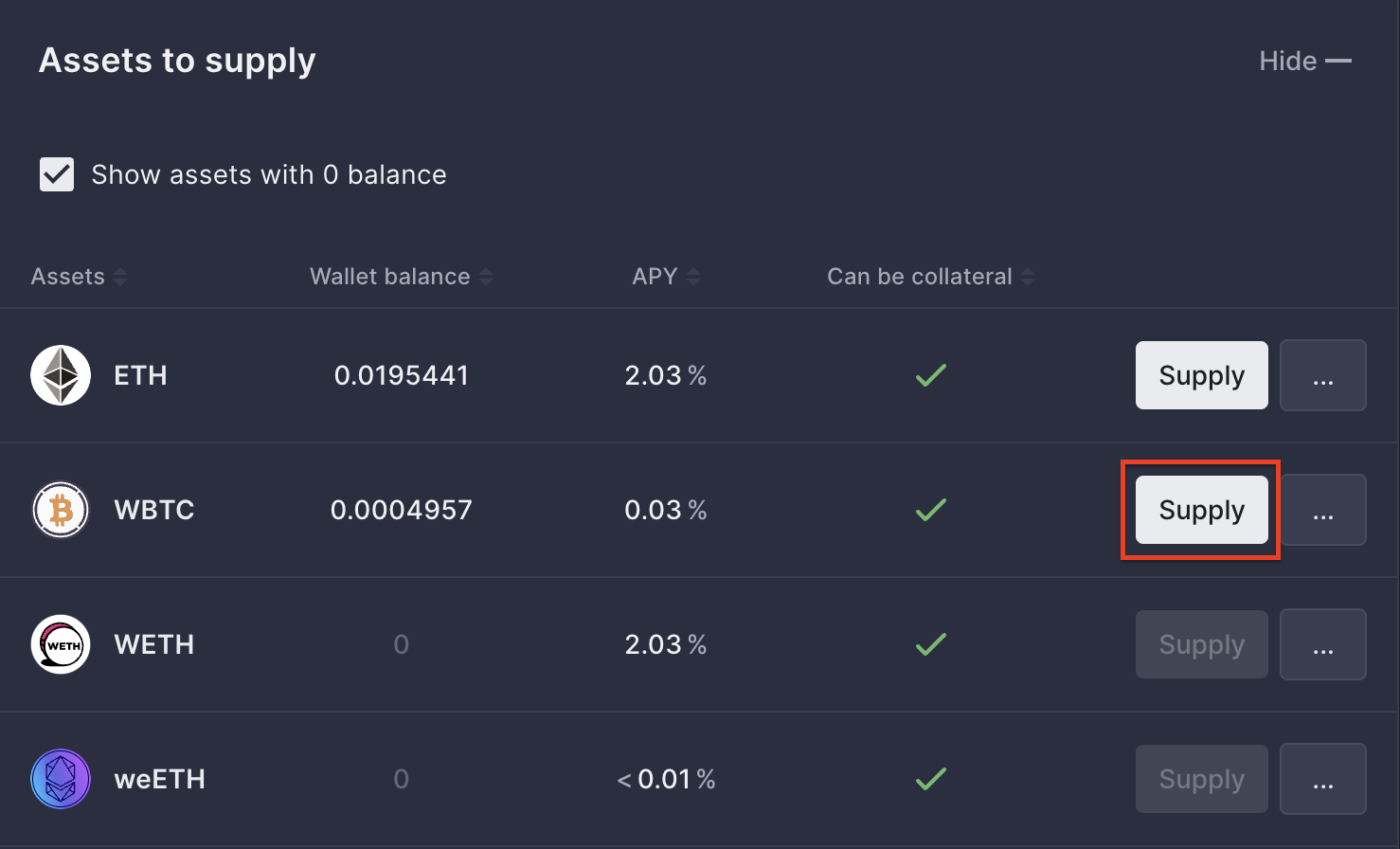 Step 7: Under “Assets to supply”, click on “Supply” next to WBTC.
