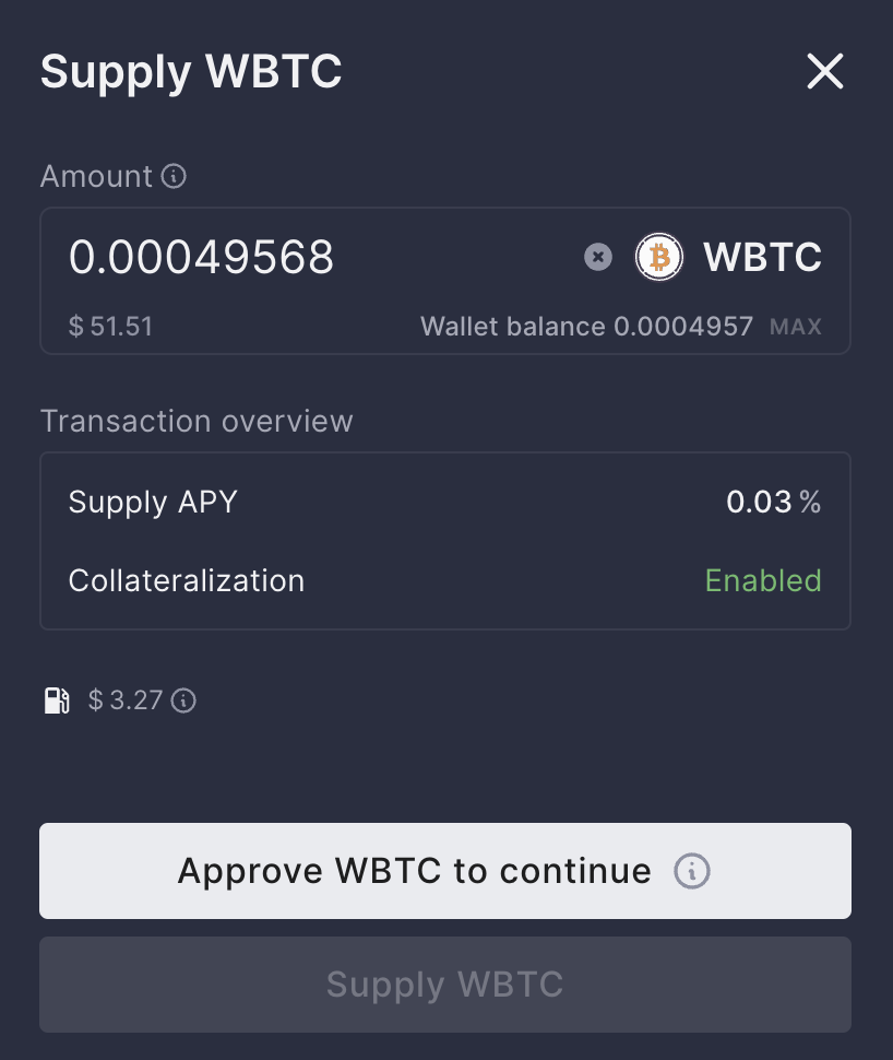 Step 9: Click “Approve WBTC to continue”. Once approved, hit “Supply WBTC”.