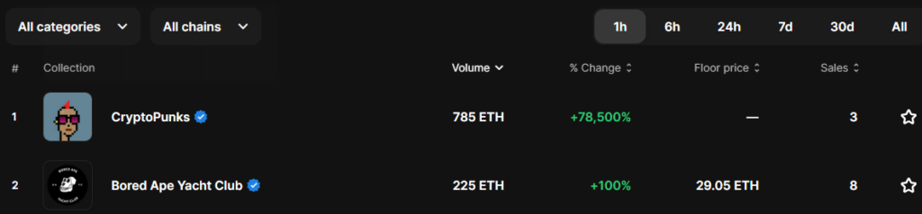 Data from OpenSea shows that in the last 24 hours, Bored Ape Yacht Club has had a trading volume of 2,495 ETH (+122%), while CryptoPunks enjoyed 1,674 ETH (+167,426%). CryptoPunks dethroned BAYC with a 785 ETH volume in the last 24 hours, as opposed to BAYC’s 225 ETH volume.