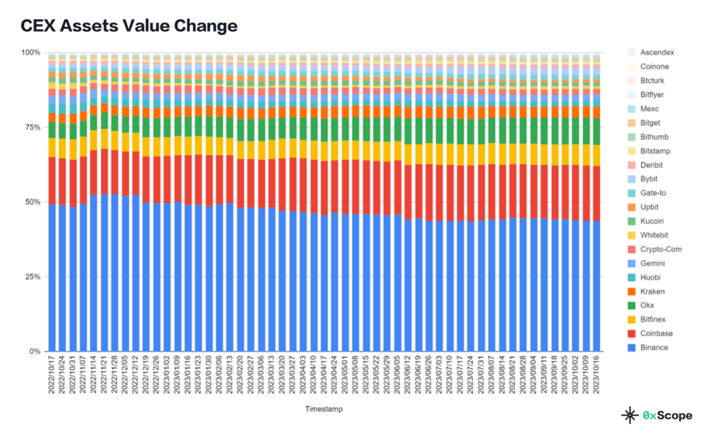 The report covers data from October 2022 to October 2023 across major centralized exchanges. While Binance still accounts for around 51.2% or more of total market share across various metrics, its position of utter dominance has weakened noticeably.