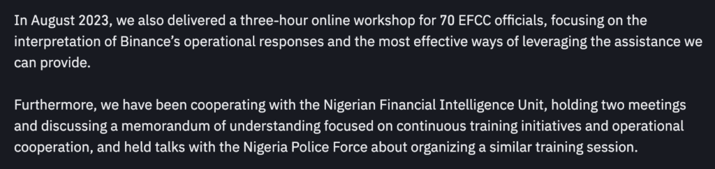 In addition to the training sessions, Binance claims to have been highly responsive to information requests from Nigerian law enforcement agencies.