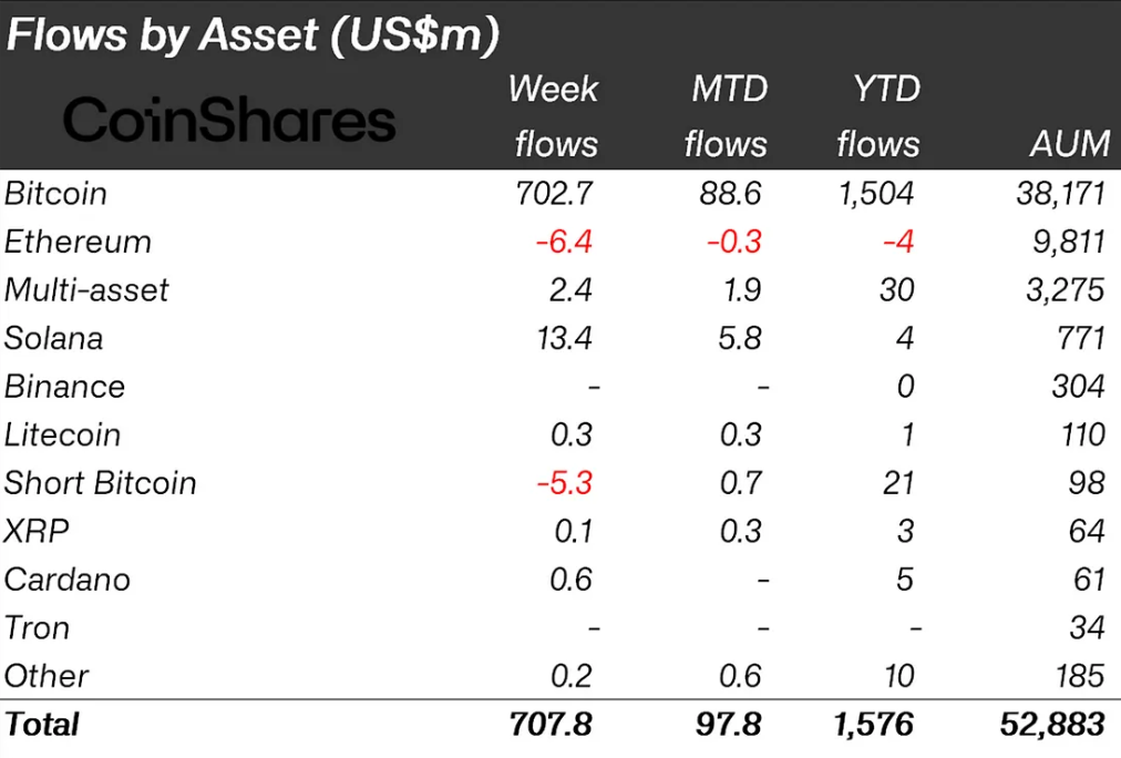 - Bitcoin led the way with $703 million, or 99% of all inflows.