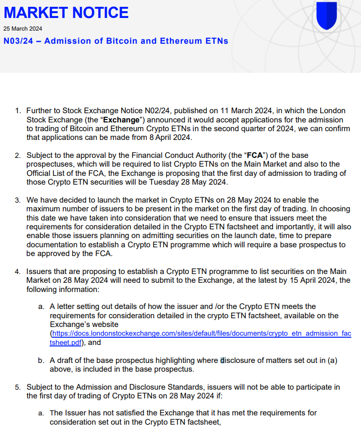The London Stock Exchange (LSE) has disclosed plans to introduce a market for exchange-traded notes (ETNs) based on Bitcoin (BTC) and Ethereum (ETH) on May 28, 2024.