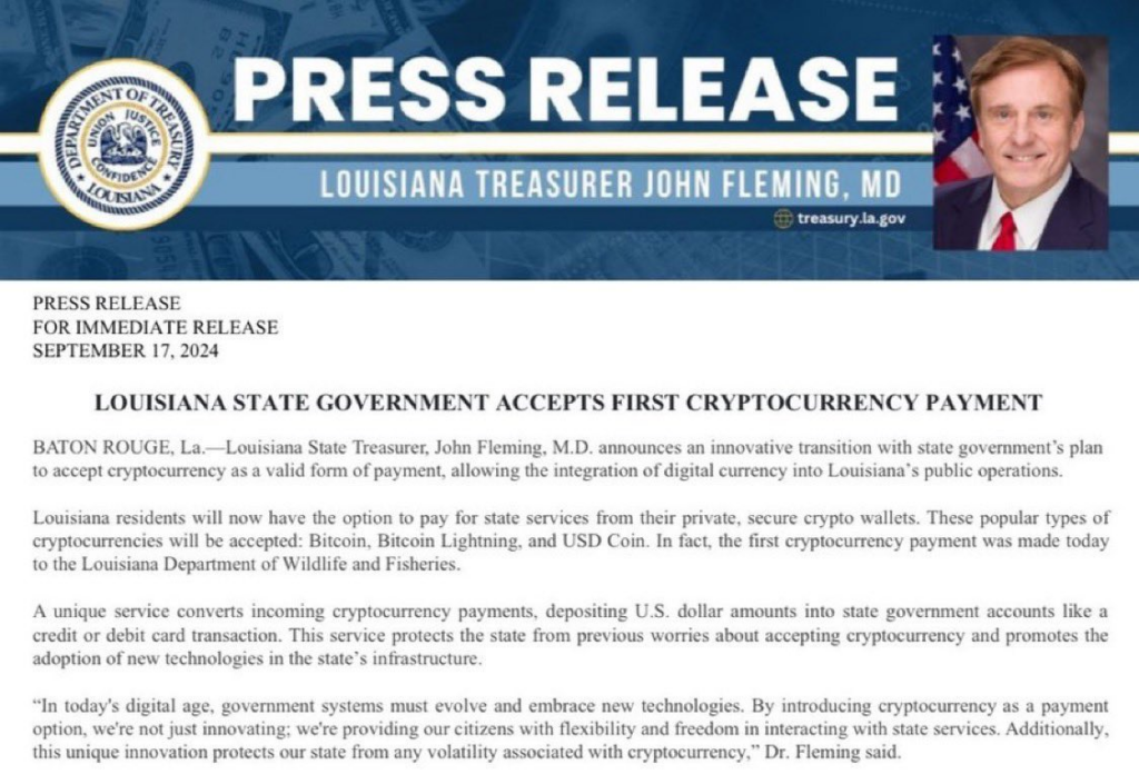Louisiana officially accepts Bitcoin and other cryptocurrencies for utility bills, marking a significant step in crypto adoption.