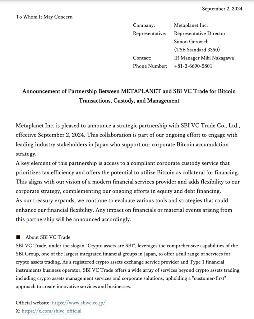 - Strategic partnership: Metaplanet collaborates with SBI VC Trade for comprehensive Bitcoin services.