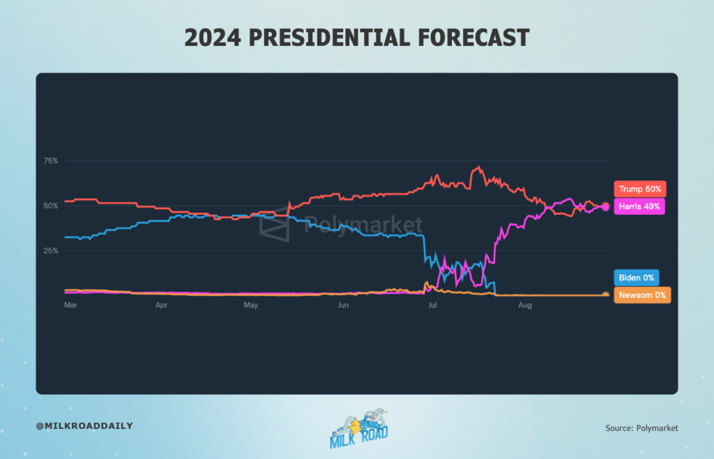 Over on Polymarket, Trump is now the frontrunner, with 51% of users betting on him to win. Kamala Harris, who was leading the odds last week, has seen her chances slide down to 47%.