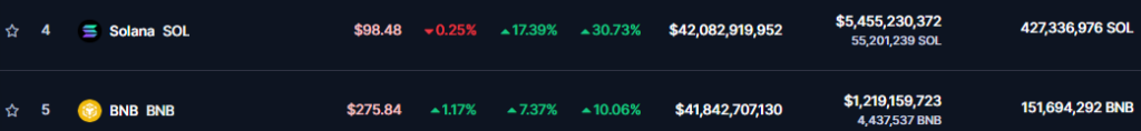 This latest price jump has led to Solana flipping Binance Coin (BNB), which now sits in the 5th spot with a market cap of $41.8 billion. Just a day earlier, Solana had surpassed XRP to become the fifth-largest cryptocurrency.