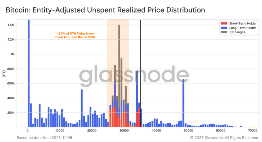 If these LTH trends continue in the lead up to the halving in April 2024, overall supply tightness could increase dramatically, according to Glassnode. However, some metrics show short-term holders recently taking profits around $35k. As prices approach former all-time highs in the $60k to $69k range, more supply could potentially unlock.