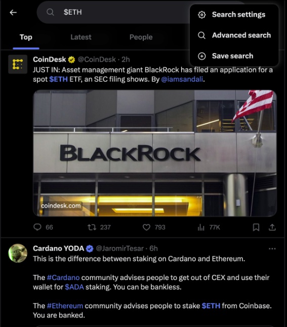 One overlooked feature of the platform is the ability to search cashtags, and implement advanced searches. Users can search any ticker symbol after a dollar sign and see what others on the platform are saying about it. Advanced search allows you to refine your search with criteria around the author or post metrics.