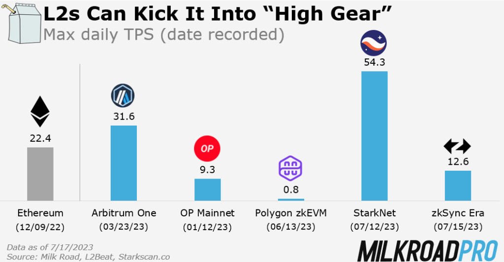 First off, these L2s are actually delivering scaling gains. Another way to see this is by looking at their max throughput, or transactions per second (TPS). Arbitrum and StarkNet have posted higher TPS (on certain days) than Ethereum ever has.