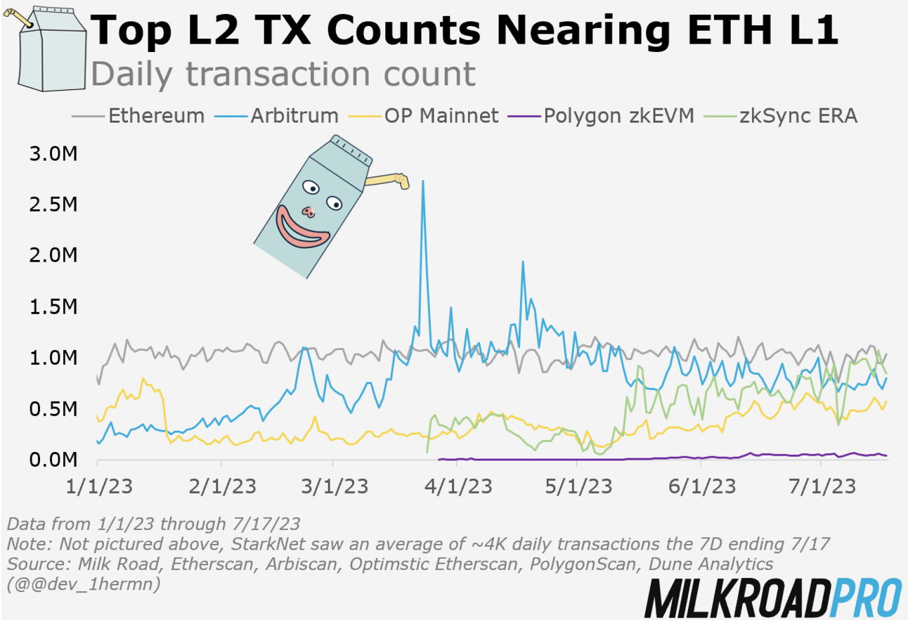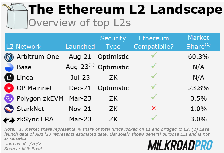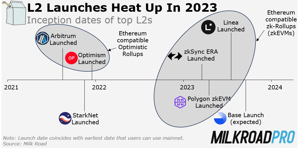 Up until now, L2s have been primarily used by crypto native users. They know how to bridge. They know how to scoop up airdrops. They’re not afraid to try new things. But with Consensys (Metamask’s parent company) launching Linea and Coinbase launching Base, we could see more “normies” transacting on L2 in the future. Both of these companies have direct relationships with their customers and will be providing avenues to onboard onto L2.