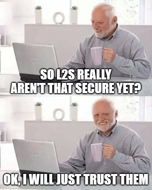 - Some optimistic rollups (e.g., Optimism) don’t have these fraud proofs active (yet). Instead, their security relies on a multisig wallet controlled by a small group of anonymous individuals.