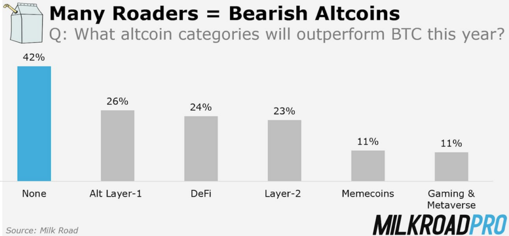 Altcoins have faced major hurdles this year. Regulatory crackdowns, exchange delistings, and lack of a compelling narrative were probably the biggest. Roaders don’t see the rest of the year being much better: 42% of them don’t see any major altcoin category outperforming BTC in H2.