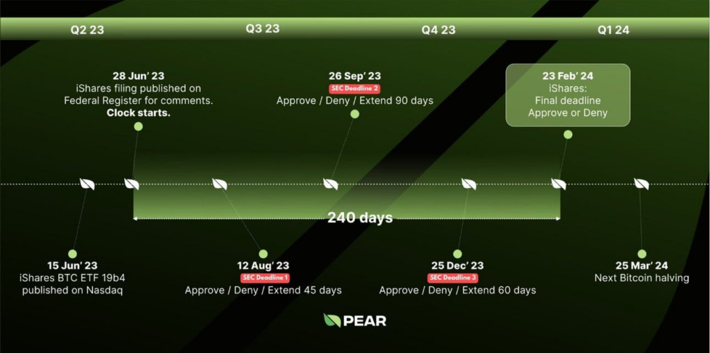 In terms of the timeline, the SEC has until August 12th to approve/deny/extend Blackrock’s Bitcoin ETF application. It will need to render a final decision by February 2024 at the latest.