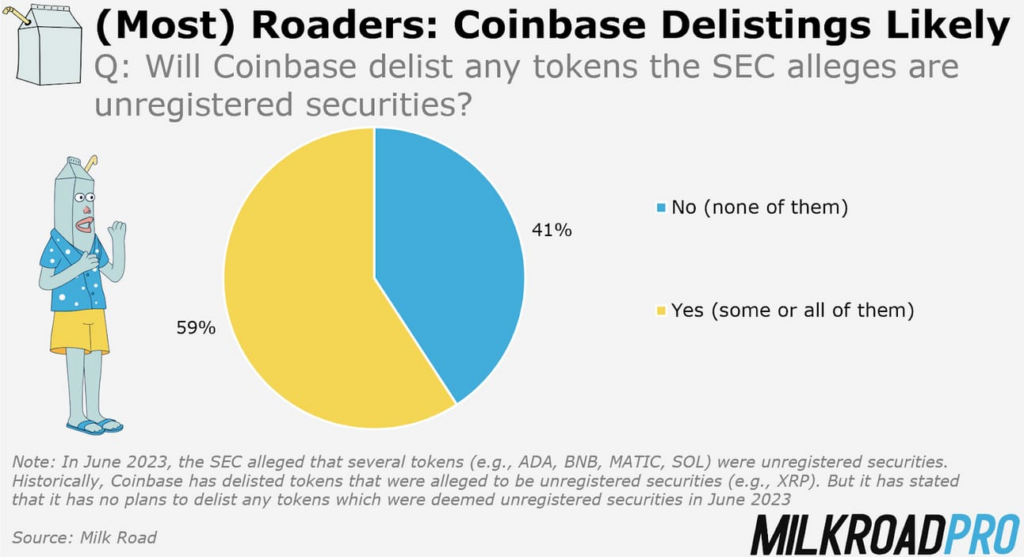 - About 60% think Coinbase will delist some or all of the tokens that the SEC has alleged are securities. Yikes.