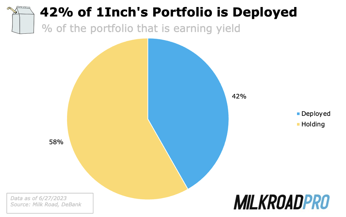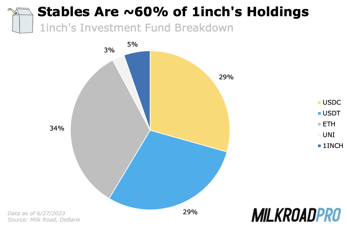 - 1inch’s investment fund is positioned conservatively, with a large allocation to stablecoins and additional yield coming from providing liquidity