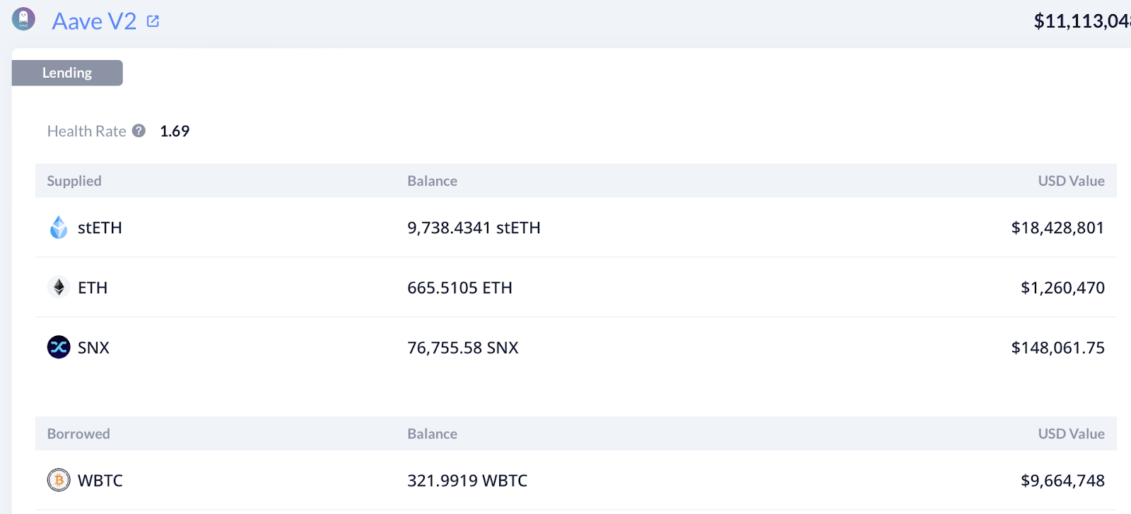 But they aren’t taking on a lot of risk to do so. While they are borrowing ~$10M in assets, they have ~$20M supplied on Aave to counter that. And with a health rate of 1.69, their risk of liquidation is extremely low. For reference, you can only be liquidated on Aave if your health rate is below 1.