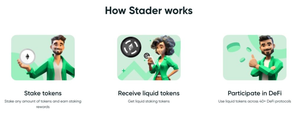 Stader’s protocol centers around liquid staking for several crypto assets, including MATIC, BNB, and its newest offering, ETH. You can exchange ETH or other supported assets for tradable liquid token that represents your staked ETH and earns a yield.