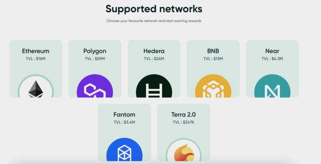 StaderETH, MATIC, HBAR, BNB, NEAR, FTM, LUNA3.5% to 15+%, depending on asset and network supply & demandWorldwide, except for sanctioned regionsCurve, Balancer, Uniswap, Aave, Beefy, and moreWide range of assets offered across multiple chains + ability for leveraged yield