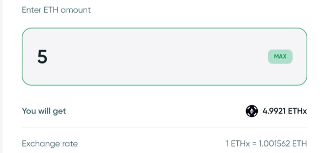 By comparison to MATIC/MATICx, the exchange rate for the newly launched ETH token is much closer to 1:1. One ETH = 0.999 ETHx.