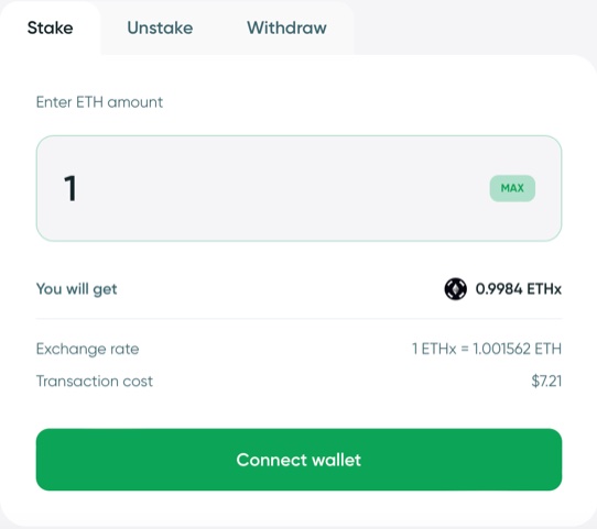 You also have the option of swapping other assets for the staked tokens on a decentralized exchange, which may be a cheaper way to go. The liquidity pool isn’t live yet, but soon you’ll be able to swap ETH for ETHx on Uniswap.