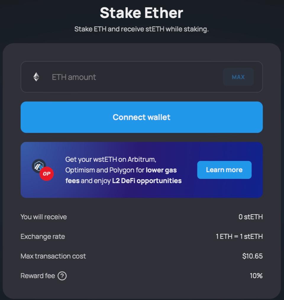 Lido’s transaction cost, seen below, is higher. However, Lido gives you the option to use lower-cost Layer 2 networks like Arbitrum, Polygon, or Optimism if you hold ETH on those blockchains.
